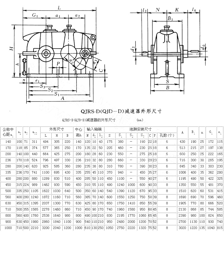 1)結構型式  QJ-D型減速器分為:QJR-D(QJB-D)型為二級,QJS-D(QJC-D)型為三級。QJRS-D(QJD-D)型為二級安裝尺寸三級速比。
